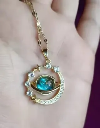Joyería en acero. Colgante con diseño inspirado en el espacio, con un planeta central y detalles de estrellas y lunas. - Material: Acero. - Color del planeta: Azul y dorado. - Adornos: Circonitas y estrellas. - Cadena de acero de longitud 39 + 6,5 cm. (Total 45,5 cm) Colgante 2,5 cm + engarce - No cambia el color ni se oxida. - Hipoalergénica. - Nueva. ### Magia brujería ocultismo sortilegio encantamiento espacio