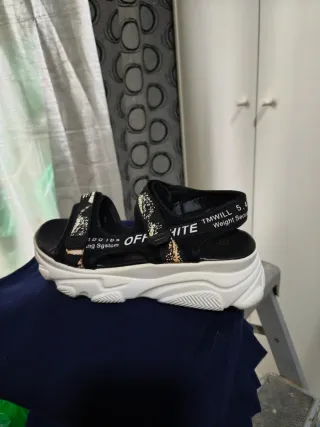Sandalias Off-White con un diseño moderno y llamativo. - Tiras con estampado. - Suela gruesa y cómoda.