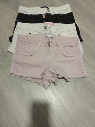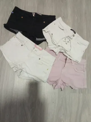 Conjunto de cuatro pantalones cortos de mujer. - Pantalón negro. - Pantalón blanco. - Pantalón blanco con cordones. - Pantalón rosa.