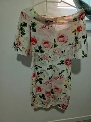 Vestido con un estampado floral de rosas en tonos rosas y blancos. Presenta un diseño elegante y femenino. - Escote Bardot. - Mangas cortas acampanadas. - Tejido ligero y fluido.