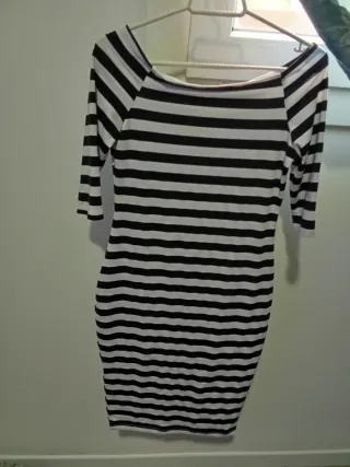 Vestido de rayas horizontales en blanco y negro. - Diseño ajustado. - Manga 3/4.