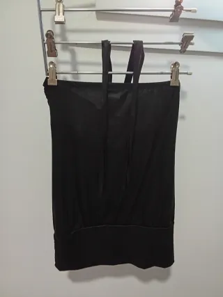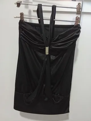 Elegante blusa negra con un diseño drapeado y un detalle metálico en el centro. - Tirantes finos. - Tejido brillante. - Corte ceñido en la parte superior.