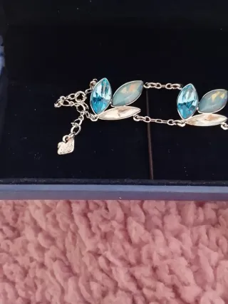Elegante pulsera con detalles en forma de hoja y cristales de Swarovski. - Cristales en tonos azules y claros. - Cadena y cierres en tono plateado. - Incluye caja original.