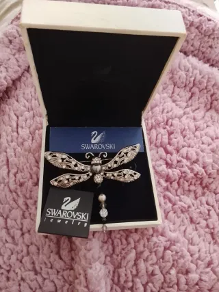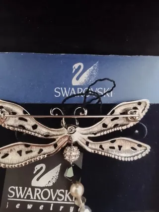 Elegante broche con diseño de libélula. - Detalles en pedrería y perlas. - Cierre de seguridad. - Incluye caja original.