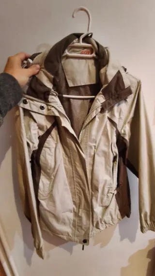 Chaqueta ligera de la marca Crivit. Chubasquero. - Diseño en color beige con detalles en marrón. - Cierre de cremallera frontal. - Capucha integrada. - Bolsillos laterales.