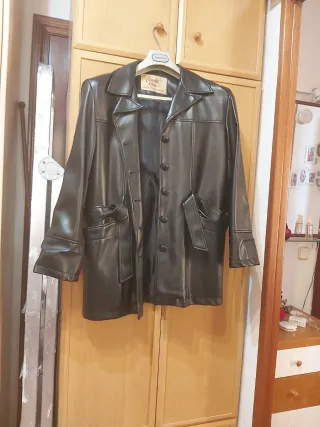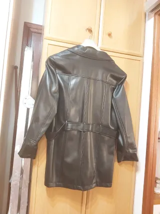 Cazadora de piel sintética con un diseño moderno y elegante. - Cierre de botones. - Bolsillos frontales con solapa. - Cinturón a juego.