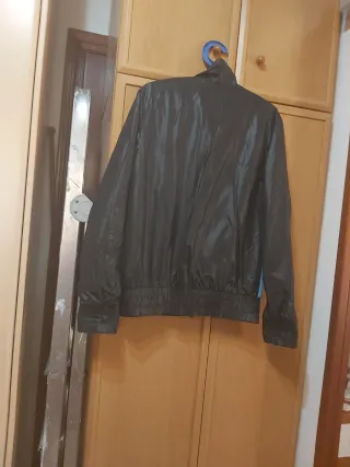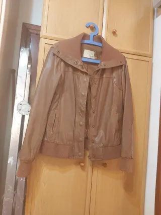 Chaqueta de piel de color marrón. - Cuello de canalé. - Puños de canalé. - Cierre de botones a presión.