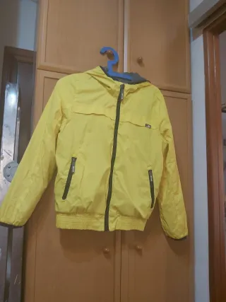 Chaqueta impermeable de color amarillo, ideal para protegerse de la lluvia. - Diseño con capucha. - Cierre de cremallera. - Bolsillos laterales con cremallera. - Puños y cintura elásticos.