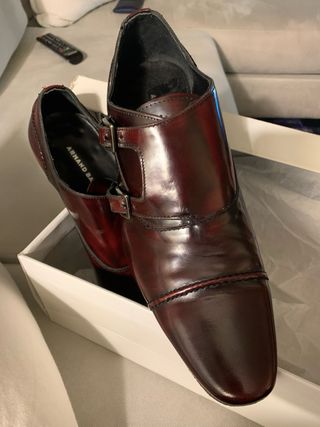 Elegantes zapatos de vestir para hombre de la marca Armand Basi. - Diseño con doble hebilla. - Acabado brillante en tono granate. - Puntera fina.
