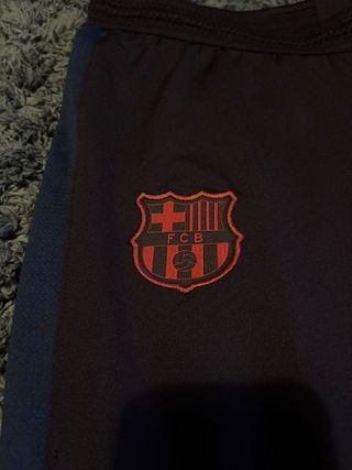 Pantalones deportivos del FC Barcelona, temporada 19/20. - Escudo del club en la pierna izquierda. - Logo de Nike en la pierna derecha. - Diseño en color morado con detalles en gris.