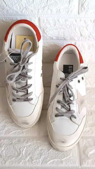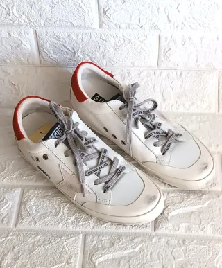 Sneakers blancas estilo urbano con estrella lateral y detalle rojo en el talón. Diseño muy combinable y moderno, con cordones grises con texto y acabado ligeramente desgastado que les da un toque casual. Están sin estrenar, solo probadas en casa. La etiqueta marca talla 40, pero tallan pequeño, equivalen aproximadamente a una 38. He puesto foto con medidas de la plantilla interior. Muy cómodas y fáciles de combinar con vaqueros, vestidos o looks casuales. Se venden porque me quedan pequeñas. Son estilo similar a G o l d e n.