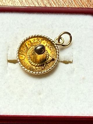 Precioso colgante con forma de sombrero mexicano, una joya traída de un viaje a este país hace años. - Fabricado en oro de 14 kilate(580/1000);con bonita patina y un peso aproximado de 1’09 gramos. -Lleva grabado el contraste de la pureza del metal. - Ancho de 13’4 mm. - Diseño detallado y muy elaborado. - Presentado en caja de joyería con fieltro suave para su transporte y entrega. Ideal para regalo y perfecto para llevar en una cadenita fina o con otros charms o colgantes conjuntamente. Entrego en mano en Madrid centro o envío solo por Wallapop envios. NO NEGOCIO PRECIO NI VENDO AL PESO;TAMPOCO ATIENDO PERFILES SIN VALORACIONES.