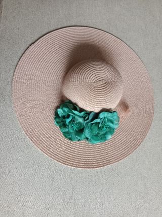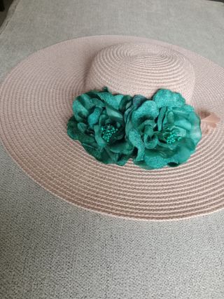 Elegante pamela de ala ancha, ideal para eventos especiales como bodas o ceremonias. Solo usado una vez - Material: rafia - Adorno floral en la parte delantera