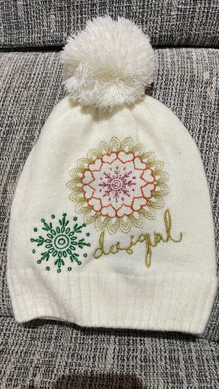 Gorro de lana con un diseño alegre y colorido de la marca Desigual. - Pompón blanco en la parte superior. - Adornado con bordados de flores y copos de nieve. - Detalle del nombre de la marca bordado.