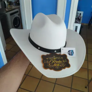 Sombrero estilo vaquero de la marca Reveles. - Talla M. - Color blanco. - Banda negra con adornos plateados. - Etiqueta de la marca incluida.