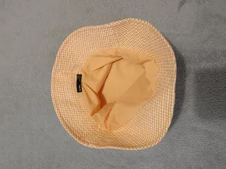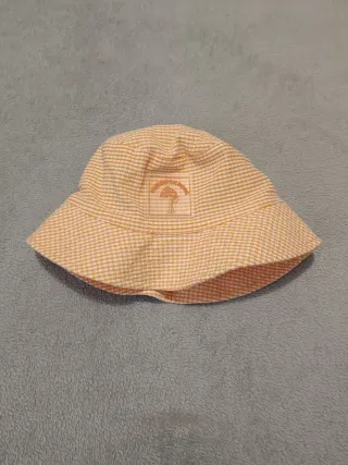 Gorro de tela con estampado de cuadros. - Diseño tipo bucket hat. - Detalle de parche con estampado de seta.