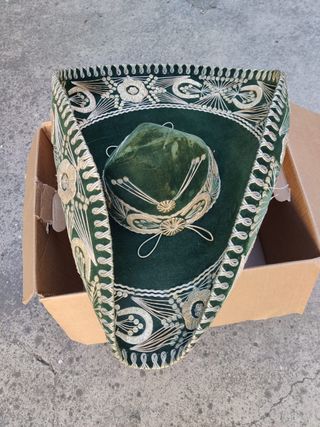 Sombrero mexicano Sombrero charro Antigüedad de un viaje a México Sombrero charro de color verde y plata, con detalles bordados. Elaborado con materiales de calidad. Sombrero de diseño tradicional mexicano. Buen estado, VER FOTOS. SOLO ENTREGA EN MANO en Sanlúcar de Barrameda o excepcionalmente en Sevilla.