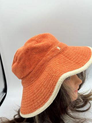Precioso sombrero tipo bucket de la marca Hermès. Es de color naranja y tiene un ribete blanco. Está en muy buen estado. Sombrero Panamá confeccionado en tejido de pelo con el logotipo de Hermès. Material: 65% algodón, 35% viscosa, forro: 100% lino. Este elegante sombrero presenta el elegante color naranja característico de Hermes y un logotipo H bordado. El material suave y afelpado también es muy atractivo. Hay varios hilos que sobresalen y zonas desgastadas. Talla 57. - Marca: Hermès - Material: Toquilla - Talla: 57