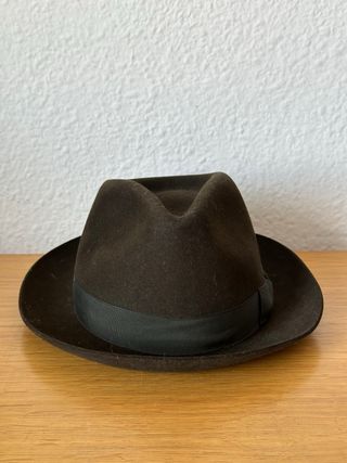 Sombrero clásico de fieltro de la emblemática sombrerería La Favorita (Plaza Mayor, Madrid). Una pieza de excelente manufactura y elegancia. • Marca: La Favorita (Madrid). • Talla: 56 • Calidad: "Calidad Extra" grabada en el forro. • Estado: Muy bien conservado. El forro interior de seda está impecable y la banda de cuero mantiene los grabados dorados nítidos.