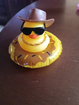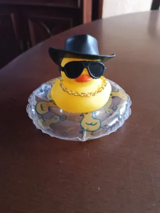 Divertido pato de goma con accesorios. - Incluye sombrero blanco. - Gafas de sol negras. - Cadena dorada. - Flotador amarillo con dibujos de patos.