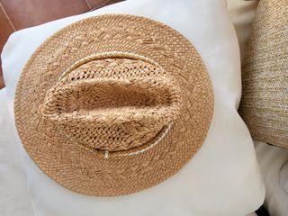 Vendo un sombrero de playa de la marca BMW. Es de color beige y blanco, y tiene un diseño elegante y veraniego. - Perfecto para protegerte del sol en la playa o piscina. - Está en muy buen estado.