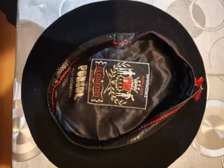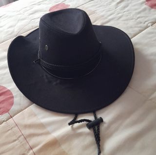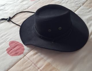 Sombrero estilo sheriff en color negro. Cuenta con una cinta decorativa alrededor de la copa y un cordón ajustable. Precio negociable - Cordón con pasador para ajustar. - Dos ojales metálicos a cada lado de la copa.