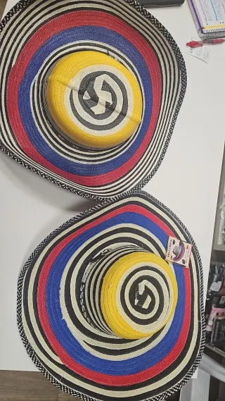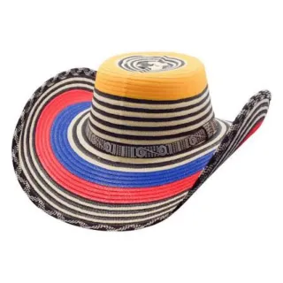 Sombrero tradicional colombiano con un diseño vibrante y llamativo. - Tejido de paja. - Diseño de rayas. - Banda decorativa con motivos. - Ala ancha.
