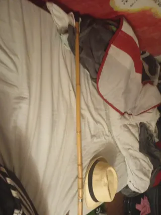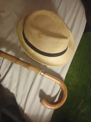 Conjunto de sombrero y bastón con mango curvo. - Sombrero de paja tejido. - Banda decorativa negra. - Bastón de bambú con detalles anillados. - Mango curvo de madera.