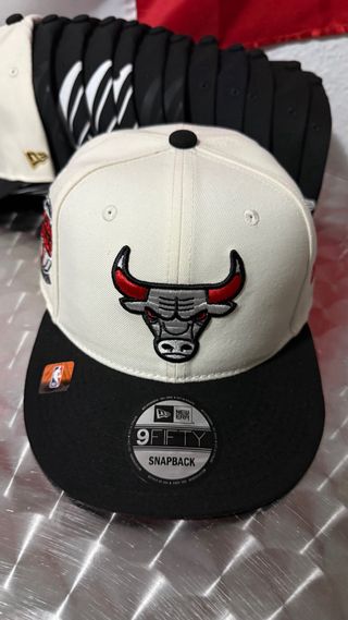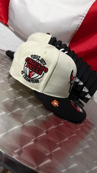 Gorra de béisbol con diseño de los Chicago Bulls. - Color principal beige con visera negra. - Parche Windy City Chicago Bulls 6x Champions bordado en la parte frontal. - Logo de los Chicago Bulls en el lateral.