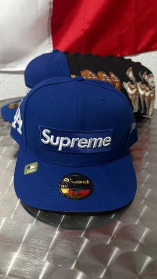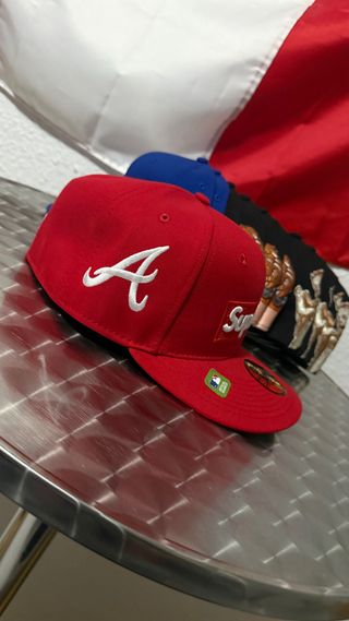 Gorra de la marca Supreme con un diseño llamativo. - Color principal rojo. - Detalle en color azul. - Logo de la marca visible.