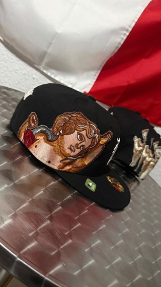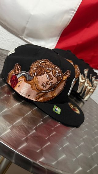 Gorra negra con un diseño único y detallado de cupido bordado en la parte frontal. Un accesorio llamativo para tu colección. - Diseño de cupido con detalles en tonos beige y marrón. - Parche de la MLB en el lateral.