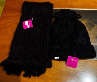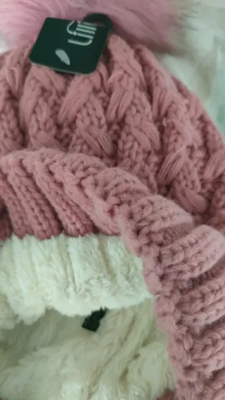 Conjunto de gorro y bufanda de punto. - Tejido suave y cálido. - Diseño con flecos en la bufanda. - Adorno de pompones en el gorro.