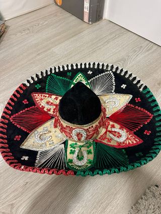 Auténtico sombrero de mariachi mexicano, un accesorio llamativo y tradicional. Colores de la bandera de México. - Diseño con bordados coloridos. - Adornos plateados y dorados. - Ala ancha y copa alta.