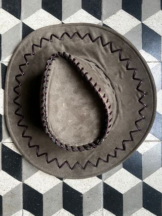 Sombrero estilo vaquero con un diseño único. - Acabado en gamuza. - Costuras decorativas en zigzag. - Borde interior trenzado.