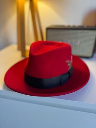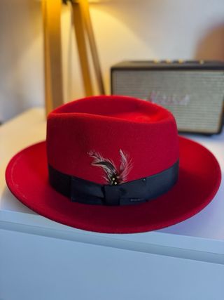 Sombrero de fieltro rojo con un diseño tradicional. - Adornado con una cuerda rústica. - Incluye un pin metálico decorativo.