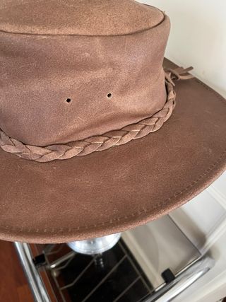 Sombrero plegable estilo vaquero de cuero, ideal para cowboy o cowgirl - Diseño con perforaciones en la copa. - Banda trenzada decorativa en dos tonos. Dela marca estadounidense Minnetonka. Talla S.