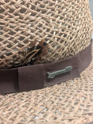 Sombrero de paja tejido a mano, con un diseño clásico y elegante. - Detalle de plumas decorativas. - Cinta de tela marrón. - Insignia metálica con el logo de la marca. Poco uso.
