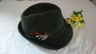 Sombrero tirolés de la marca Mathias Hutter. Lana compactada.Talla 57. Medidas: 28 cms de largo, 25 cms de ancho y 16 cms de altura. Apto para regalar. - Color verde con detalles multicolor. - Adornado con plumas y cordón trenzado.