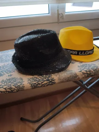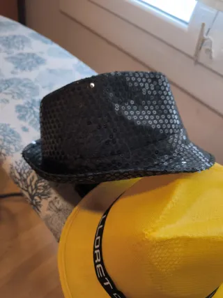 Conjunto de dos sombreros, uno negro con lentejuelas y otro amarillo. - Sombrero negro con acabado brillante de lentejuelas. - Sombrero amarillo con banda decorativa.