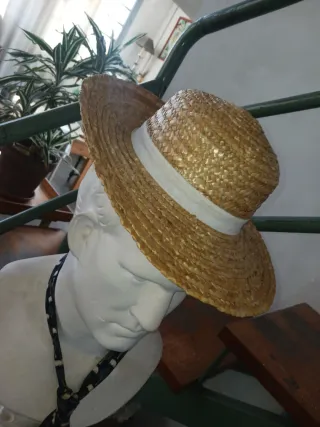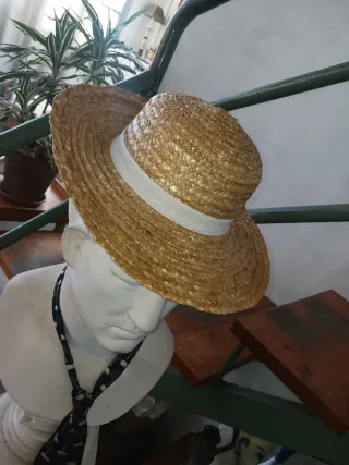 Sombrero de paja de color beige, perfecto para protegerse del sol. Ø 43cm exterior, 20cm interior - Material: Paja tejida. - Diseño: Ala ancha.