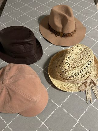 Conjunto de cuatro sombreros, ideal para diferentes estaciones. - Un sombrero de verano. 5 € - Tres sombreros de invierno. Borsalino jaspeado gris 5€, boina verde 5€, fieltro color teja 10€