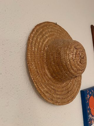 Sombrero de yute tejido a mano, perfecto para protegerse del sol con estilo. - Material: Yute - Color: Beige y marrón - Diseño tejido circular - Lo tenemos de adorno en la pared pero se puede usar como sombrero perfectamente