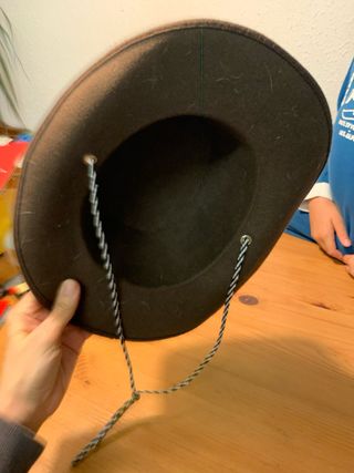 Sombrero vaquero de cuero auténtico en perfecto estado. Lo vendo por ser un regalo y quedarme grande. Puesto únicamente una única vez. Perfecto para disfraces, uso cotidiano o como fetiche. Talla M/L (circunferencia 58 cm) - Diseño con banda trenzada - Ojales para ventilación