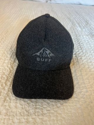 Gorra de tela con diseño de montaña. - Color negro y gris jaspeado. - Logo de Buff en la parte frontal. - En perfecto estado. - Sin señales de uso.