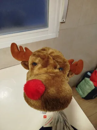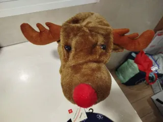 Divertido gorro con forma de reno, perfecto para las fiestas. - Diseño de reno con cuernos y nariz roja. - Material suave y cómodo.