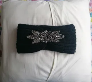 Diadema de punto en color negro con un bonito detalle de pedrería. - Diseño tipo turbante. - Adorno central con pedrería plateada.