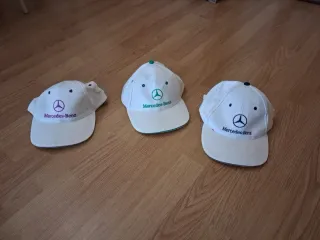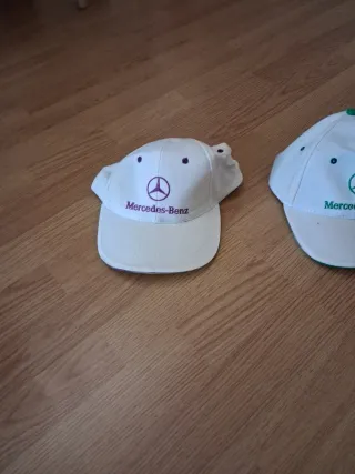 Lote de tres gorras de Mercedes-Benz. - Gorra blanca con detalles morados y logo. - Gorra blanca con detalles verdes y logo. - Gorra blanca con detalles negros y logo. Precio 28 las 3 , o 8 euros una suelta.