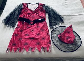 Disfraz de bruja para adulto con un diseño de telaraña. - Mangas largas de encaje negro. - Cinturón negro con detalle de araña. - Incluye sombrero a juego.