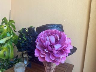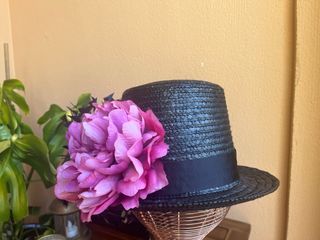 Elegante sombrero tipo chistera, perfecto para eventos especiales o como accesorio de moda. - Diseño clásico de chistera. - Adornado con una llamativa flor. - Material de paja tejido. Se acercan los eventos y tienes que estar preparada! Chistera de rafia negra con cinta negra, ramo de plumas negras en el lateral y flor rosa fucsia. Ideal para celebraciones de día y tarde. Es muy ligera, no pesa nada y se adapta perfectamente sin necesidad de sujeción. Está hecha a mano y nunca se ha usado. Es única. Lo que necesitas para ser la invitada perfecta sin gastar mucho dinero. Llamarás la atención por su originalidad