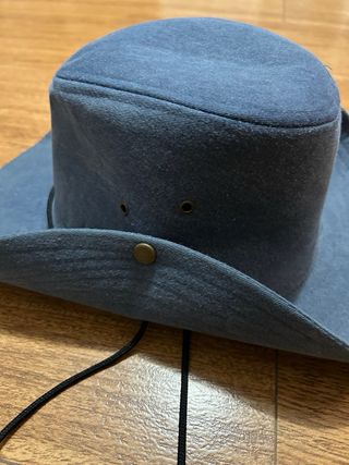 Sombrero estilo vaquero de color azul. Cuenta con una cuerda ajustable para mayor comodidad. - Ala ancha para protección solar. - Detalle de ojal en los laterales. - Cuerda negra con cierre ajustable.